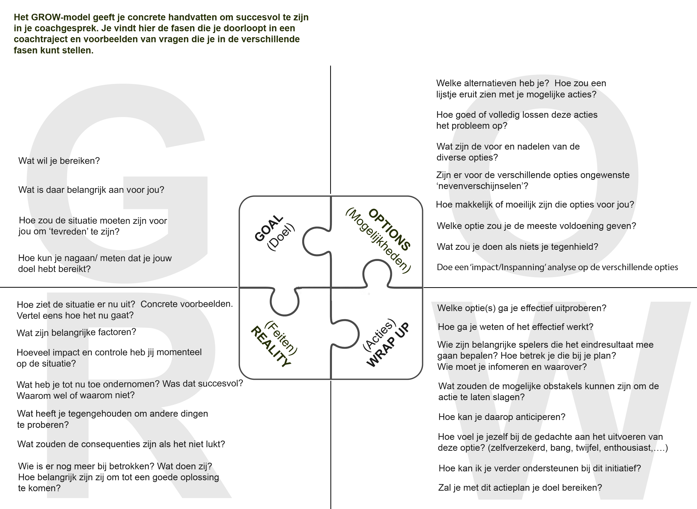 De kracht van dit stappenplan is dat het in vier overzichtelijke stappen leidt tot een duidelijk eindresultaat. Doordat je coachee zélf actief is in het verhelderen van het probleem en het genereren van ideeën, beklijft de output beter. Je coachee komt als het ware zélf tot oplossingen. In een vervolgsessie bekijken jullie samen of de afspraken hebben geleid tot het gewenste resultaat en pakken jullie verder door op het thema waar nodig.